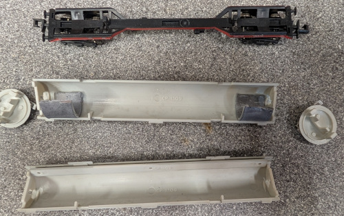 The Virgin carriages have a weight of 27g each. The oil tankers are only 11g, so I decided to add some lead weights (aiming for 13g each tanker). The tanker body is clipped together - no glue. The end caps can be prised off using a scalpel; thereafter the body simply opens up.